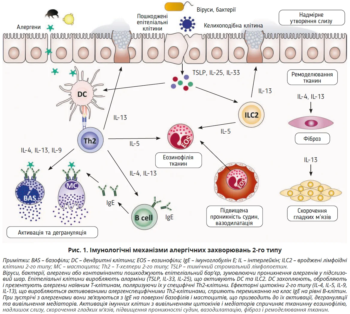 Алергічне запалення виникає в генетично сприйнятливих осіб після сенсибілізації при контакті із зовнішніми причинними алергенами за механізмами, здебільшого пов’язаними з аномальними запальними реакціями 2-го типу. IgE-опосередкована дегрануляція ефекторних клітин (мастоцитів, базофілів), епітеліальні аларміни (TSLP, IL-33 або IL-25) та ефекторні цитокіни 2-го типу (IL-4, IL-5, IL-9, IL-13, IL-31), що виробляються алерген специфічними клітинами Th2 та ILC2, спричиняють тканинну еозинофілію, гіперпродукцію слизу, скорочення гладкої мускулатури, підвищену проникність судин, вазодилатацію, фіброз і ремоделювання тканин, що асоціюються з тяжкими хронічними клінічними проявами алергії (рис. 1).