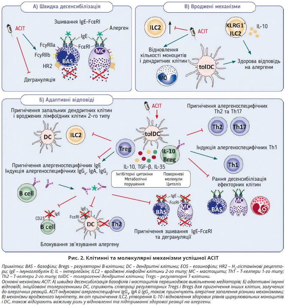 Принципом АСІТ є введення високих доз причинних алергенів підшкірно або сублінгвально для досягнення стійкої толерантності до алергену після припинення лікування. Відразу після першого введення алергену AСIT забезпечує десенсибілізацію мастоцитів і базофілів (рис. 2A). Механізми, відповідальні за швидку десенсибілізацію, охоплюють підвищення експресії кількох супресивних рецепторів на ефекторних клітинах, зокрема рецепторів IgG з низькою спорідненістю (FcγRIIa та FcγRIIb) або Н2-гістамінових рецепторів, які після активації порушують індуковане алергеном зшивання IgE-FcεRI та дегрануляцію ефекторних клітин (рис. 2A).