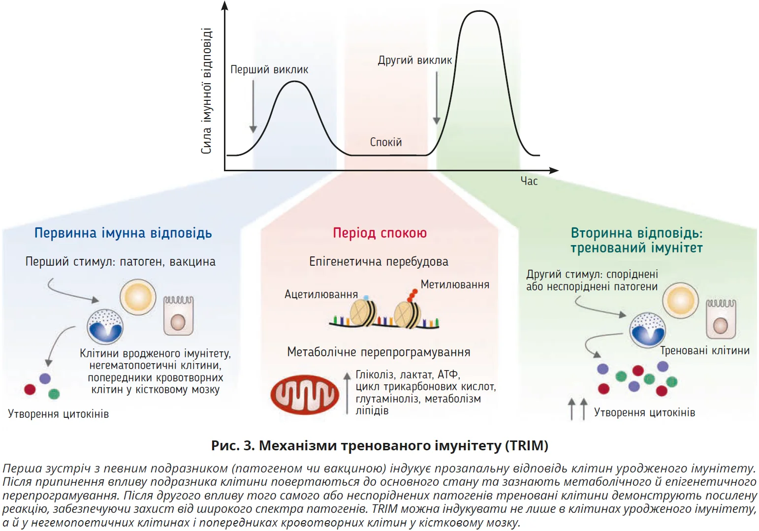 За визначенням, TRIM – це здатність клітин уродженого імунітету набувати пам’яті за механізмами епігенетичної та метаболічної перебудови. Тобто TRIM є механізмом пам’яті клітин уродженого імунітету, що надає неспецифічний захист від інфекцій. Коли клітини вродженого імунітету вперше стикаються з певними подразниками (патогеном або вакциною), вони виробляють першу прозапальну відповідь. Після її припинення та залежно від стимулу клітини вродженого імунітету можуть зазнавати метаболічного й епігенетичного перепрограмування. При повторній зустрічі з тим самим або, що дуже важливо, з іншими неспорідненими патогенами навчені клітини здатні реагувати набагато швидше й ефективніше, забезпечуючи захист від широкого спектра гетерологічних патогенів (рис. 3). Раніше вважалося, що TRIM стосується клітин уродженого імунітету (моноцитів/макрофагів, NK-клітин, ILC2, DC, нейтрофілів) і певних типів негематопоетичних клітин (фібробластів, епітеліоцитів, ендотеліоцитів) – так звана концепція «периферичного TRIM». Нещодавно переконливо продемонстровано, що TRIM відбувається в кістковому мозку, поширюючись на попередники кровотворних клітин – «центральний TRIM», що дає змогу поповнювати циркулювальні вроджені клітини пам’яті, забезпечуючи тривалі відповіді впродовж тижнів-місяців. Незважаючи на певну суперечливість, декілька досліджень показали, що TRIM може передаватися нащадкам різними механізмами, як-от епігенетичне успадкування, передача імунних компонентів від матері або опосередкована мікробіотою передача. Епігенетичне й метаболічне перепрограмування є жорстко регульованими та взаємопов’язаними молекулярними механізмами, що індукують TRIM (рис. 3). Після першого зіткнення з індукторами TRIM придбання активних позначок хроматину,