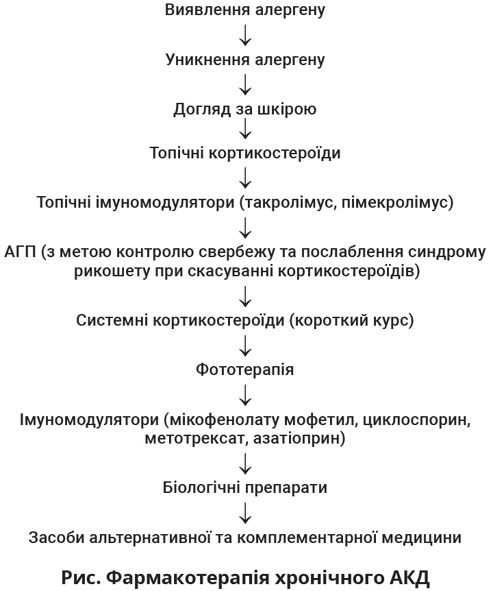 У разі хронічного АКД алгоритм лікування передбачає рух від найпростіших до найскладніших методів (рис.). У цьому алгоритмі АГП додаються до місцевого лікування з метою контролю свербежу або ослаблення феномену рикошету при скасуванні топічних кортикостероїдів (Jacob S.E., Castanedo-Tardan M.P., 2007).