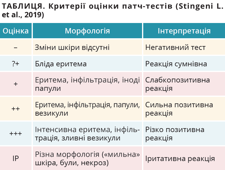 Цінну інформацію для встановлення діагнозу надають патч-тести з підозрюваними алергенами, які дають змогу відтворити реакцію гіперчутливості. Оскільки точне встановлення причинного алергену за даними анамнезу та фізикального обстеження є дуже складним, для початкової діагностики застосовуються набори найпоширеніших локально алергенів. Якщо ж анамнез свідчить про іншу потенційну причину, застосовуються додаткові патчі. Перед проведенням тесту лікар має переконатися у відсутності протипоказань: наявності тяжкого/генералізованого дерматиту в ділянці накладання патчів з алергеном, системного лікування імуносупресантами (наприклад, преднізолоном у дозі >10 мг/добу), нещодавнього (впродовж <7 днів тому) застосування топічних кортикостероїдів і нещодавнього ультрафіолетового опромінення діагностичної ділянки. Слід зауважити, що деякі речовини для патч-тестів можуть провокувати подразнення, котре є хибнопозитивним результатом. Зазвичай подразненню, на відміну від алергічної реакції, притаманні чіткі краї еритеми та поява дрібних зморшок поверхні шкіри (табл.) (Stingeni L. et al., 2019; Tramontana M. et al., 2023).