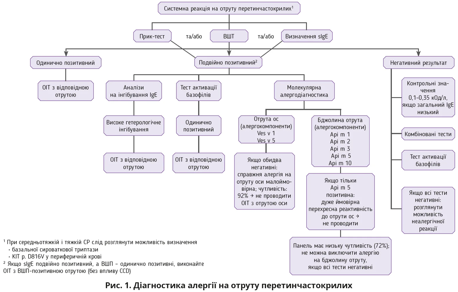 Першим кроком у діагностиці ІАП є шкірні прик-тести, внутрішньошкірні тести (ВШТ) та/або визначення специфічних сироваткових IgE до отрути перетинчастокрилих. Ці тести можна комбінувати для підвищення чутливості. Якщо тести є позитивними до одного виду отрути, слід розпочати ОІТ з відповідною отрутою. Якщо sIgE є подвійно позитивним, а ВШТ – одинично позитивним, треба проводити ОІТ з отрутою, яка є позитивною до ВШТ, оскільки на ВШТ не впливають CCD (перехресно-реактивні вуглеводні детермінанти). У разі подвійної позитивної реакції можуть бути проведені аналізи реципрокного IgE-інгібування, тест активації базофілів або молекулярна алергодіагностика. Визначення IgE до CCD MUXF3 на відміну від використання при множинній сенсибілізації до пилку або харчових продуктів обмежено. Оскільки CCD різні за вмістом в отруті комах, чутливість тесту MUXF3 є низькою та становить 52%. Крім того, наявність IgE до CCD не виключає справжньої подвійної сенсибілізації [6]. Молекулярна діагностика ІАП наразі має обмежене застосування, оскільки не всі відповідні алергени доступні. Однак, якщо обидва тести, Ves v 1 і 5, є негативними, алергія на отруту оси малоймовірна [17]. Чутливість наявної панелі алергенів бджолиної отрути є низькою. Використовуючи цю панель, неможливо діагностувати або виключити алергію на бджолину отруту повністю, але моносенсибілізація до Api m 5 може вказувати на перехресну реактивність до отрути ос. Окрім того, було показано, що тест активації базофілів має нижчий ризик виявлення подвійної сенсибілізації. Однак у разі тяжкої СР і чітких подвійно позитивних результатів тесту треба провести тест активації базофілів з обома отрутами. Якщо загальний IgE низький (<30 кОд/л), рівень sIgE від 0,10 до 0,35 кОд/л можна вважати позитивним. Якщо всі тести негативні, слід розглянути можливість неалергічних реакцій, як-от панічна реакція. Важливо, що в пацієнтів з низьким рівнем загального IgE тести можуть бути негативними, навіть за тяжкої СР.