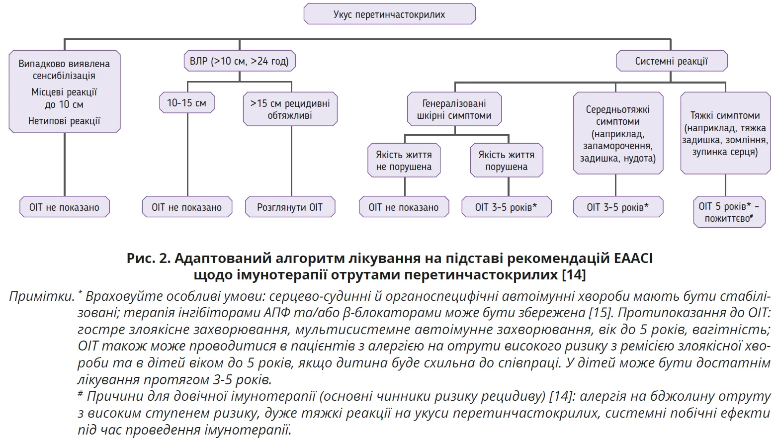 ОІТ також рекомендовано дорослим пацієнтам з СР, що обмежуються генералізованими шкірними симптомами, якщо якість життя через них значно погіршена. У пацієнтів з рецидивними, проблемними ВЛР також можливе зменшення тривалості та розміру майбутніх ВЛР. Від моменту публікації настанови з’явилася низка даних, що сприяли полегшенню проведення процедур ОІТ: після десятиліть дебатів у європейському багатоцентровому дослідженні було переконливо продемонстровано, що застосування β-блокаторів або інгібіторів ангіотензинперетворювального ферменту (АПФ) не призводить до ескалації системних небажаних явищ під час ОІТ і не збільшує СР. Окрім того, ці препарати не впливають на ефективність ОІТ [15]. У контексті подвійної ОІТ бджолиною отрутою й отрутою ос одночасне введення обох отрут також визнано безпечним у великій серії випадків [16]. Алгоритм лікування, представлений на рисунку 2, ґрунтується на рекомендаціях настанов.