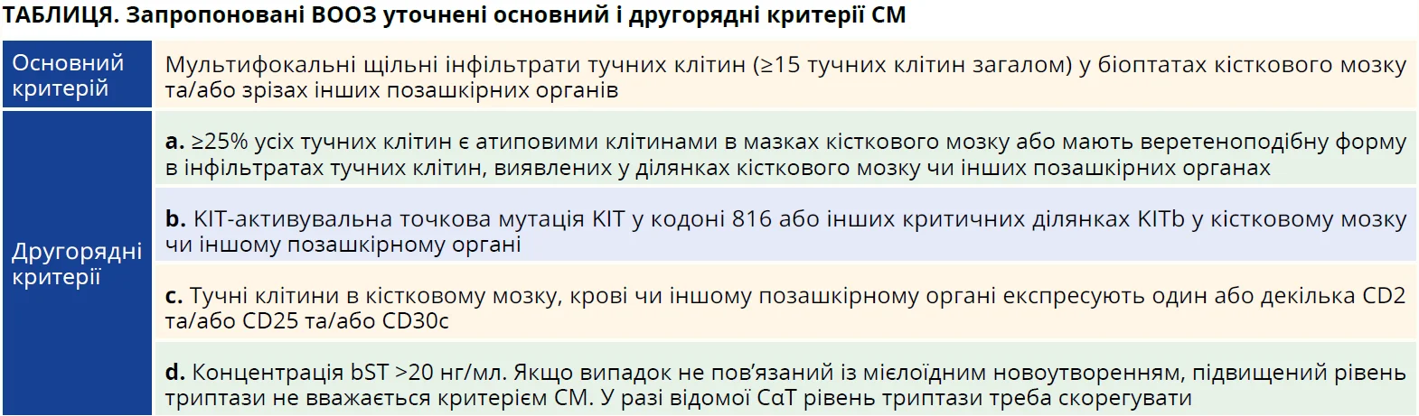 Оновлені діагностичні критерії шкірного та системного мастоцитозу, запропоновані Всесвітньою організацією охорони здоров’я (ВООЗ), наведено в таблиці. Виявлення щонайменше 15 тучних клітин в агрегатах під час біопсії кісткового мозку є основним критерієм для діагностики СМ.