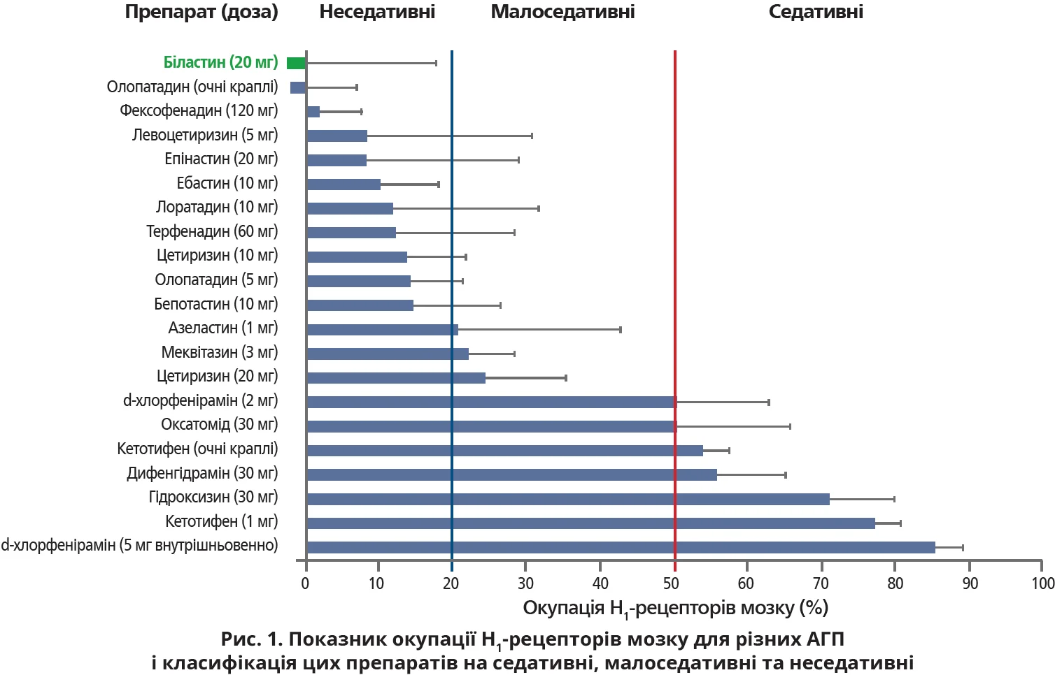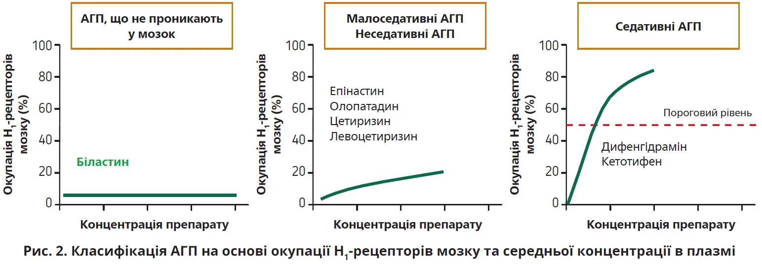 Для реалізації седативної дії АГП повинні проходити крізь гематоенцефалічний бар’єр і зв’язуватися з H1-рецепторами, тому для визначення седативного потенціалу застосовується оцінка ступеня окупації гістамінових рецепторів типу H1 (H1RO). Після визначення H1RO багатьох АГП першого та другого поколінь було запропоновано відповідну класифікацію цих препаратів на неседативні (H1RO після одноразового перорального застосування <20%), малоседативні (20-50%) і седативні (≥50%). До неседативних АГП належать біластин (20 мг), фексофенадин (60-120 мг), левоцетиризин (5 мг), епінастин (20 мг), ебастин (10 мг), лоратадин (10 мг), терфенадин (60 мг), цетиризин (10 мг), олопатадин (5 мг) і бепотастин (10 мг) (рис. 1). Хімічній структурі неседативних АГП притаманна наявність гідрофільних функціональних груп, а саме карбоксильної (-COOH) та/або аміногрупи (-NH2), які протидіють пенетрації в мозок.