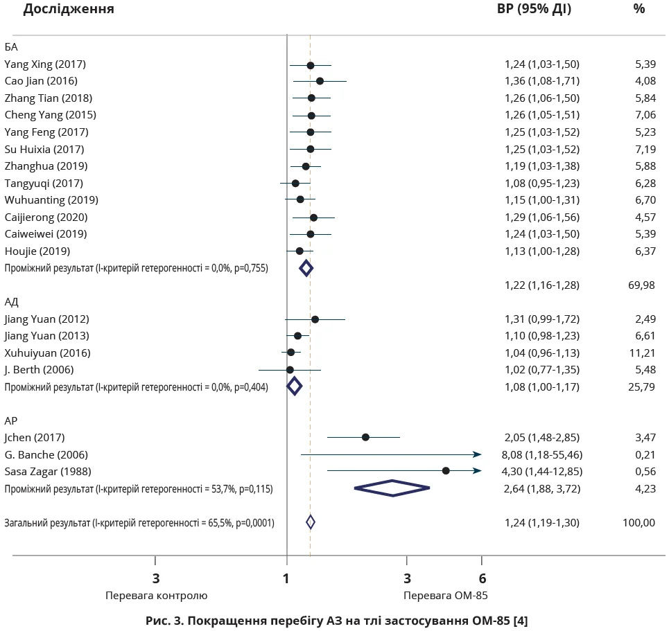 Ефект використання ОМ-85 при АД становив 1,08 (95% ДІ 1,0-1,17), що автори розцінили як невелике, статистично незначуще покращання (рис. 3).