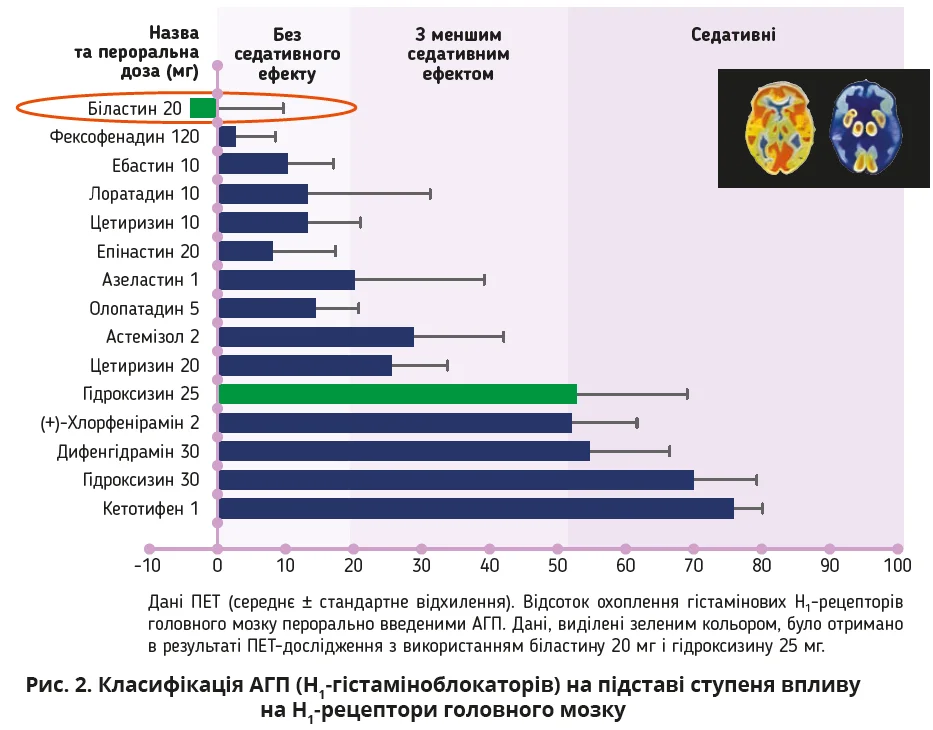 Біластин як препарат вибору. Біластин повністю відповідає всім зазначеним критеріям. Він демонструє найвищу спорідненість до H1-рецепторів серед усіх АГП й активно виводиться з мозку через гематоенцефалічний бар’єр [5, 6].