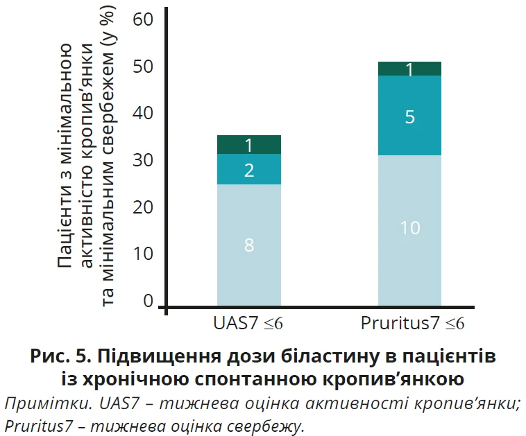 При хронічній спонтанній кропив’янці підвищення дози біластину також сприяє значному збільшенню кількості пацієнтів, що досягають контролю симптомів [9] (рис. 5).
