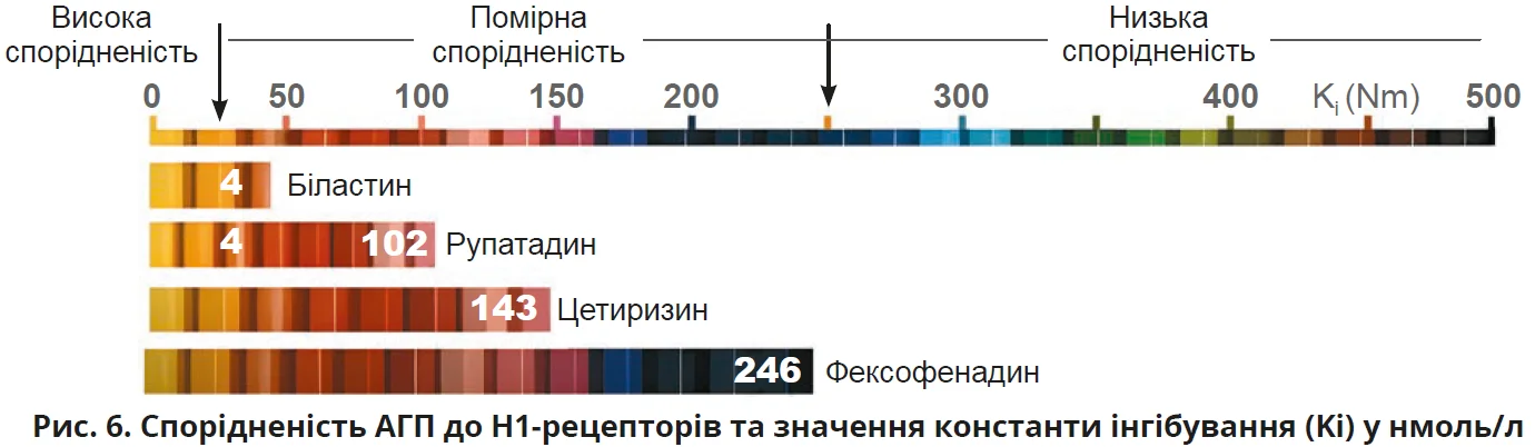 Біластин також демонструє найвищу спорідненість до H1-рецепторів серед АГП 2 покоління з константою інгібування всього 44 нмоль/л [6, 10] (рис. 6). Вища спорідненість до рецептора забезпечує більш ефективну та тривалу блокаду гістамінових рецепторів.
