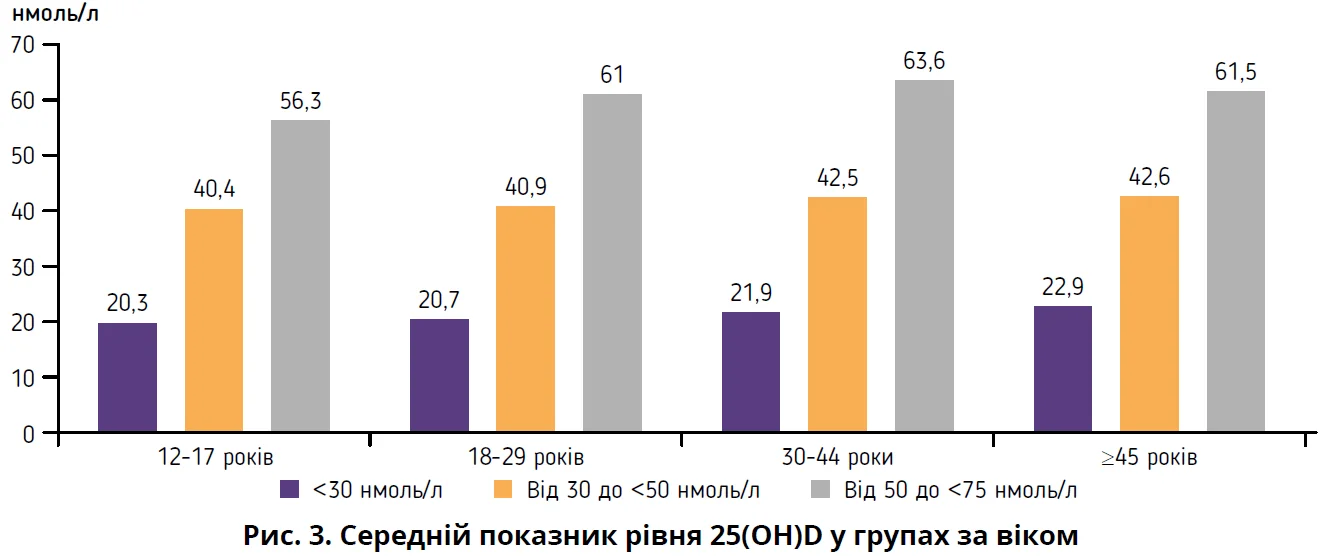 Статус вітаміну D оцінювали відповідно до Консенсусної заяви експертів Центральної та Східної Європи, згідно з якою дефіцит діагностують при рівні 25(ОН)D у сироватці крові нижче 50 нмоль/л (20 нг/мл), недостатність – при рівні 25(ОН)D 50-75 нмоль/л (21-30 нг/мл); концентрацію 25(ОН)D від 75 до 150 нмоль/л (31-85 нг/мл) вважають такою, що є в межах норми [18, 19].