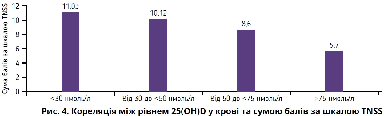 Усі пацієнти заповнювали опитувальник загальної шкали назальних симптомів (TNSS). Середній показник TNSS у групі пацієнтів з тяжким дефіцитом вітаміну D (<30 нмоль/л) становив 11,33±3,09, у групі пацієнтів з дефіцитом 25(ОН)D (від 30 до <50 нмоль/л) – 10,12±3,19, тоді як у групі пацієнтів, які мали недостатній рівень 25(ОН)D (від 50 до <75 нмоль/л), – 8,6±2,68. У пацієнтів, які не мали дефіциту вітаміну D, середній показник TNSS дорівнював 5,7±1,45 (рис. 3).