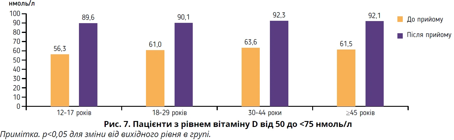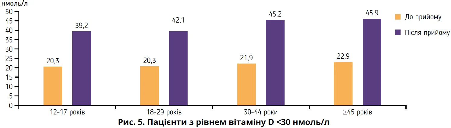 Ефективна корекція дефіциту вітаміну D у пацієнтів з АР допомагає знизити тяжкість його перебігу. Останній метааналіз, який було опубліковано в червні 2024 року [28], свідчить про ефективність використання вітаміну D в комплексній терапії АР. У своєму дослідженні ми продемонстрували, що корекція дефіциту вітаміну D за допомогою дієтичної добавки Детрімакс® супроводжувалася достовірними позитивними змінами рівня 25(ОН)D у сироватці крові. Зокрема, рівень вітаміну D достовірно підвищувався при його дефіциті з 20,3±2,07 до 39,2±2,04 нмоль/л (р<0,05) у групі пацієнтів віком 12-17 років з дуже низьким рівнем 25(ОН)D (<30 нмоль/л). Ця тенденція зберігалася і в інших вікових категоріях з тим самим рівнем недостат­ності 25(ОН)D: 18-29 років – із 20,7±1,45 до 42,1±2,14 нмоль/л, р<0,05; 30-44 роки – з 21,9±2,05 до 45,2±2,14 нмоль/л, р<0,05; ³45 років – із 22,9±1,56 до 45,9±1,14 нмоль/л, р<0,05. Оскільки в цих групах рівень не досяг оптимальних показників, пацієнтам було рекомендовано продовжити вживання Детрімакс® у дозуванні 2000 МО/добу. Важливою також є тенденція до зростання рівня вітаміну D до оптимального його значення в сироватці крові (75 нмоль/л) в інших групах, тому їм запропоновано продовжити прийом Детрімакс® у дозуванні 800-1000 МО/добу.