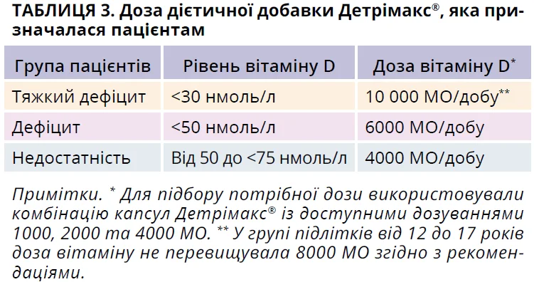 Після визначення рівня 25(ОН)D для корекції його дефіциту пацієнтам була запропонована саплементація вітаміну D бренду Детрімакс® . До складу входить холекальциферол, який є ефективнішим за ергокальциферол у підвищенні загальної концентрації 25(OH)D та підтриманні цільових рівнів протягом довшого часу. Доза дієтичної добавки Детрімакс® призначалася на підставі опублікованої 2022 року Консенсусної заяви експертів Центральної та Східної Європи [18, 19].
