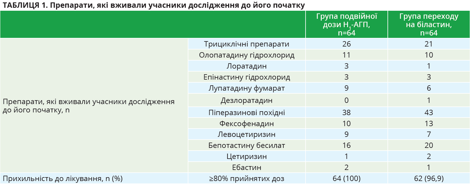 У цьому матеріалі описано багатоцентрове рандомізоване клінічне дослідження IV фази за участю пацієнтів з ХСК, які не відповідали на лікування стандартними дозами Н1-АГП другого покоління, крім біластину. Учасників було рандомізовано в групи переходу на біластин (20 мг/добу) або подвоєння дози попереднього Н1-АГП протягом 7 днів. Первинною кінцевою точкою вважали середню загальну оцінку симптомів (TSS) на 5-7-й день лікування, вторинними кінцевими точками – зміну оцінки за Епвортською шкалою сонливості порівняно з вихідним рівнем, оцінку за шкалою активності кропив’янки (UAS), зміну якості життя тощо. Середній вік учасників групи подвійної дози Н1-АГП становив 52,3±18,4 року, учасників групи біластину – 49,4±18,0 року. До Н1-АГП, які найчастіше приймали пацієнти дослідження, належали олопатадину гідрохлорид, лоратадин, епінастину гідрохлорид, лупатадину фумарат, дезлоратадин, фексофенадин, левоцетиризин, бепотастину бесилат, цетиризин, ебастин (табл. 1).