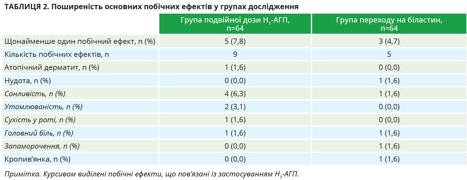 Що стосується безпеки, то тяжких побічних явищ будь-якого виду лікування зафіксовано не було. У групі подвійних доз H1-АГП побічні реакції виникли в 7,8% учасників, а в групі переходу на біластин – у 4,7% учасників. Сонливість, слабкість, сухість у роті, головний біль і запаморочення, потенційно пов’язані з H1-АГП, спостерігалися в 5 осіб групи подвоєння доз (8 проявів) та у 2 осіб групи переходу на біластин (3 прояви) (табл. 2).