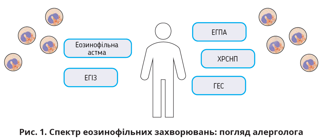 Еозинофільні хвороби – це гетерогенні стани з підвищеною кількістю еозинофілів у крові та/або тканинах, що уражають кілька систем органів через аномалії в регуляції кількості й активації еозинофілів. Ці розлади охоплюють поширені респіраторні хвороби, як-от еозинофільна астма, хронічний риносинусит з назальними поліпами (ХРСНП), менш поширені еозинофільні гастроінтестинальні захворювання (ЕГІЗ) і рідкісні еозинофільний гранулематоз із поліангіїтом (ЕГПА) та гіпереозинофільний синдром (ГЕС) (рис. 1).