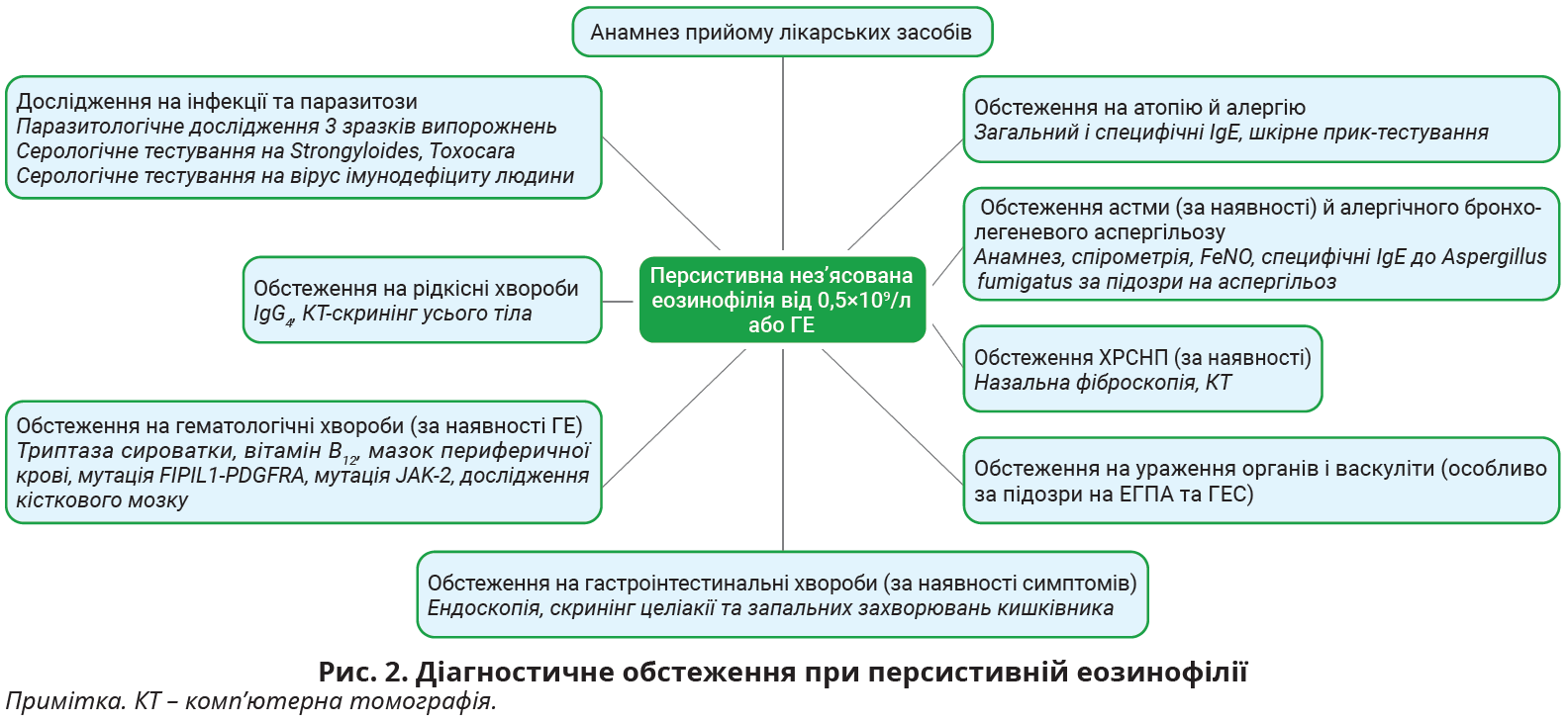 Еозинофільні розлади є численними та мають різну етіологію. Рідкісні хвороби, пов’язані з еозинофілією, включають сімейну еозинофілію, гіпер-IgE-синдром, синдром Оменна, епізодичний ангіоневротичний набряк з еозинофілією (синдром Глейха), а також синдром еозинофілії та міалгії. Докладний анамнез подорожей і тестування на паразитарні інвазії є важливими для визначення інфекційної етіології. Підвищення рівня IgE є неспецифічною ознакою, яка здебільшого спостерігається при реактивних станах (інфекційні, алергічні, васкуліт і лімфоцитарний варіант ГЕС). Додаткові лабораторні дослідження й візуалізаційні тести можуть знадобитися з огляду на анамнез, симптоми та результати фізичного огляду. Діагностичне обстеження в разі стійкої еозинофілії або нез’ясованої ГЕ підсумовано на рисунку 2.