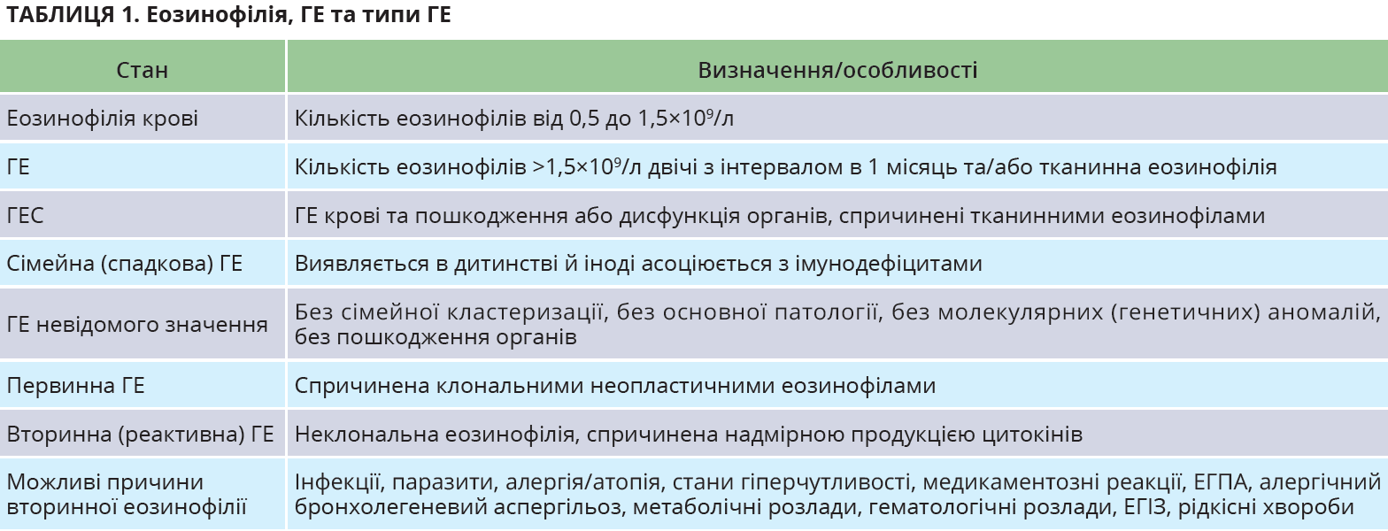 Еозинофілія крові може бути абсолютною (>0,5×109/л), відносною (>6%) або комбінованою (>0,5×109/л і >6%). Абсолютну поділяють на легку еозинофілію (0,5-1,49×109/л), помірну гіпереозинофілію – ГЕ (1,5-5,0×109/л) і тяжку ГЕ (>5,0×109/л). Діагностичний підхід до еозинофільних синдромів починається з поділу на первинні та вторинні (реактивні) стани (табл. 1).