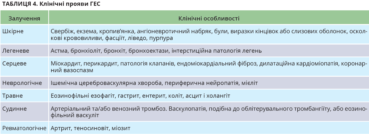 ГЕС визначається наявністю тривалої ГЕ крові (>1,5×109/л) або тканинної ГЕ й опосередкованим еозинофілами ураженням органів або тканин. ГЕС є рідкісним захворюванням і поділяється на клінічні варіанти (табл. 3).