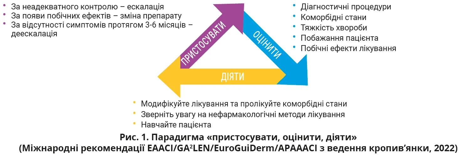 Парадигма «пристосувати, оцінити, діяти» передбачає постійну періодичну оцінку перебігу хвороби пацієнта за допомогою тесту контролю кропив’янки з метою адаптації лікування (рис. 1).