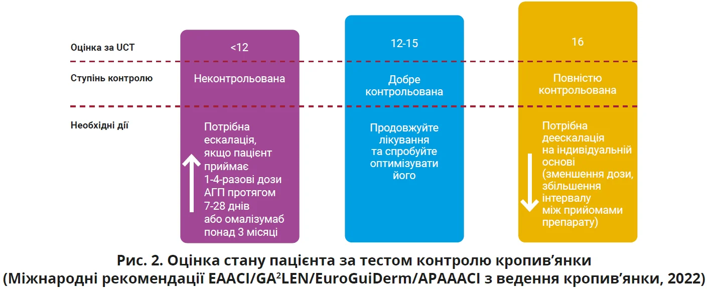 Тест контролю кропив’янки являє собою опитувальник із чотирьох запитань, який дає змогу розподілити пацієнтів на групи повністю контрольованої, добре контрольованої та неконтрольованої хвороби (рис. 2).