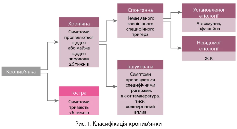 За впливом певних тригерів кропив’янка класифікується на індуковану та спонтанну (рис. 1). Хронічна індукована кропив’янка (ХІК) характеризується певними специфічними тригерами розвитку пухирів та/або АНН. Ці тригери є певними, оскільки патологія завжди виникає, коли тригер присутній, і ніколи не виникає за його відсутності. Тригери є специфічними, оскільки кожен підтип індукованої кропив’янки має свій відповідний тригер (наприклад, холод для холодової кропив’янки), який не є релевантним для інших форм. Існують рідкісні підтипи індукованої кропив’янки, за яких для появи симптомів потрібна комбінація двох або більше певних специфічних тригерів (наприклад, холодова холінергічна кропив’янка) [4].