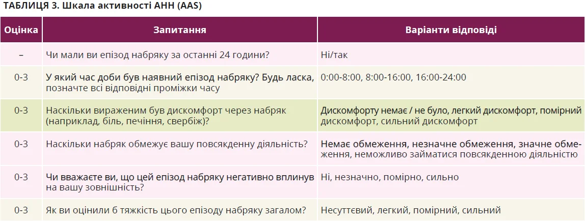 Основною метою ведення пацієнтів з ХК є лікування хвороби до повного зникнення симптомів. Терапія має бути якомога ефективнішою та безпечнішою, що дає змогу повного контролю хвороби й нормалізації якості життя. Фармакологічне лікування має тривати доти, доки в ньому не зникне потреба. Контроль над симптомами оцінюють за шкалами активності кропив’янки (Urticaria Activity Score – UAS) й АНН (Angioedema Activity Score – AAS) (табл. 2 та 3) [4].
