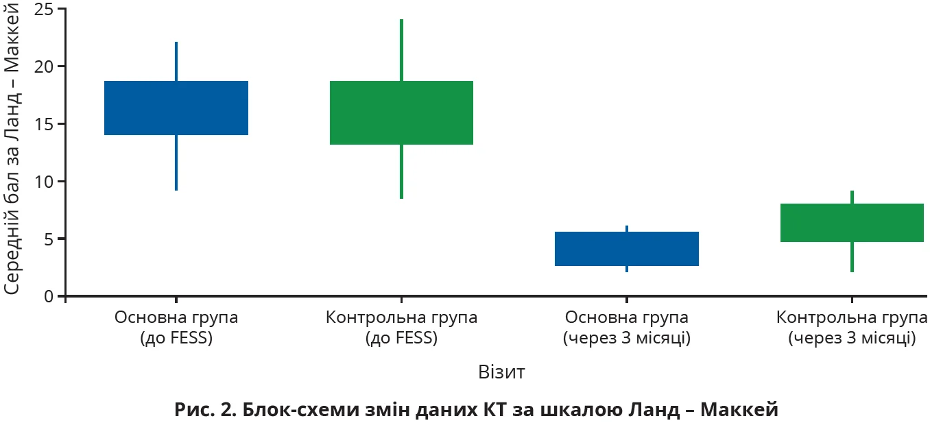 На рисунку показано, що до хірургічного втручання середні значення шкали Ланд – Маккей були статистично подібні. Проте через 3 місяці після хірургії середнє значення для основної групи становило 4±1,4 бала, а для контрольної групи – 6,25±1,55 бала, що при порівнянні показувало настання статистично достовірної різниці з Р=0,0012 (Р<0,05). Тому об’єктивні дані КТ ПНП показують, що в основній групі контроль захворювання був вищим. Варто зазначити, що значення шкали Ланд – Маккей >5 балів вважається рецидивом ХРС.