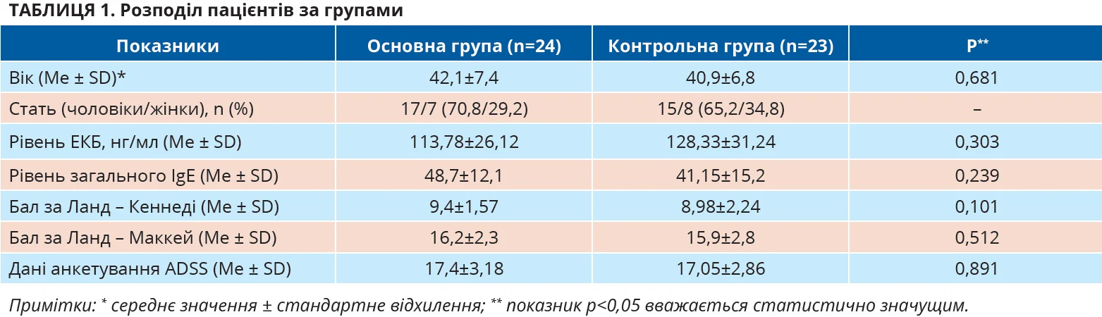 Враховуючи лабораторні показники (ЕКБ, загальний IgE), дані ендоскопії, КТ ПНП, анкетування, вік і стать, пацієнтів було рівномірно розподілено на дві групи: основна (додатково в післяопераційному періоді отримували оригінальний монтелукаст (Сингуляр) 10 мг) і контрольна (отримували лише регламентоване лікування). Основна група налічувала 24 особи, контрольна – 23. Дані щодо розподілу пацієнтів за вищезгаданими критеріями наведено в таблиці 1. У таблиці також указано значення достовірності, отримані при порівнянні результатів між групами. Зважаючи на те що розподіл пацієнтів був контрольований, статистично достовірна різниця між групами вибірки відсутня.