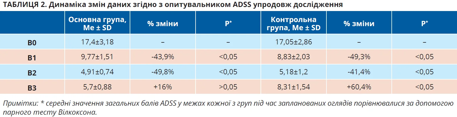 При оцінюванні назальних симптомів за опитувальником ADSS виявилося, що після хірургічного втручання вже на 7-й день пацієнти обох груп відзначали значне зниження симптомів ХРС. При цьому наприкінці першого місяця дані опитувальника вказували, що в усієї вибірки симптоми знизилися вдвічі порівняно з оглядом до операції. До другого післяопераційного візиту зниження симптомів було статистично достовірним в обох групах. Тоді як основна група показувала добрий контроль симптомів на третій місяць після FESS, у контрольній групі результат був протилежним: симптоми (закладеність носа та постназальне затікання) достовірно збільшилися (в середньому на 60,4%) на В3. Окремим питанням для деяких пацієнтів в обох групах став симптом порушення нюху: в 10,6% випадків нюх не покращився або не відновився після хірургічного втручання. Дані динаміки змін середніх балів ADSS наведено в таблиці 2.