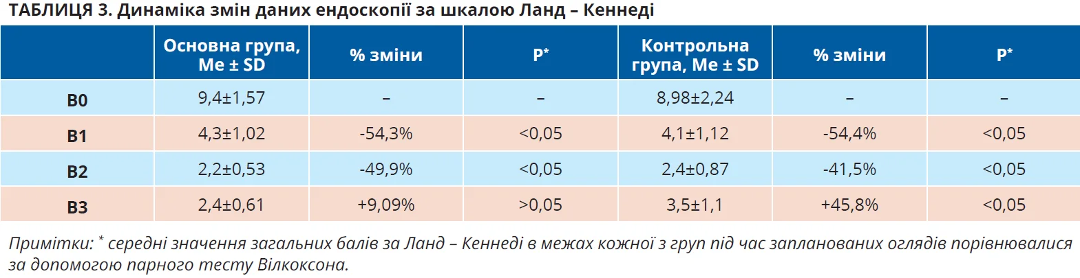 Згідно з дизайном дослідження повторні огляди пацієнтів були заплановані через 7 днів, 1 і 3 місяці після операції. Тому, користуючись умовним позначенням «В» (візит), було порівняно динаміку клінічних, ендоскопічних і рентгенологічних змін у хворих обох груп. Отже, В0 – огляд до операції, В1 – візит на 7-й день після операції, В2 – візит через 1 місяць, В3 – візит через 3 місяці.