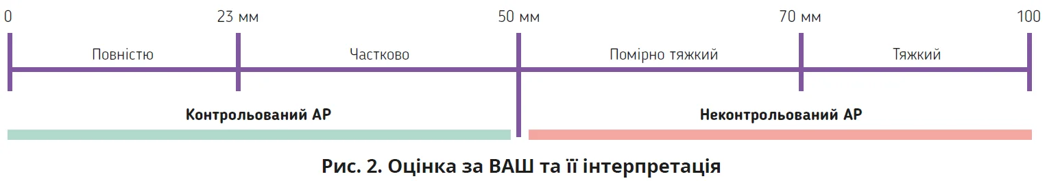 У ході роботи групи експертів було обговорено й узгоджено ключові визначення в галузі АР, зокрема такі фундаментальні поняття, як контроль, ремісія, одужання тощо. У контексті хронічних захворювань, у тому числі АР, контроль зазвичай є головною метою лікування, адже повне вилікування є рідкісним явищем. Запропоновано таке визначення контролю: ступінь досягнення терапевтичних цілей, визначений пацієнтом і лікарем, що його лікує. Для об’єктивізації контролю рекомендується використання візуальної аналогової шкали (ВАШ) як пацієнтом, так і лікарем. З метою оцінювання загальної тяжкості симптомів АР варто застосовувати такі граничні значення: ≤23 мм за ВАШ – хороший контроль; >23 мм, але ≤50 мм – частковий контроль; >50 мм – неконтрольований АР (рис. 2).