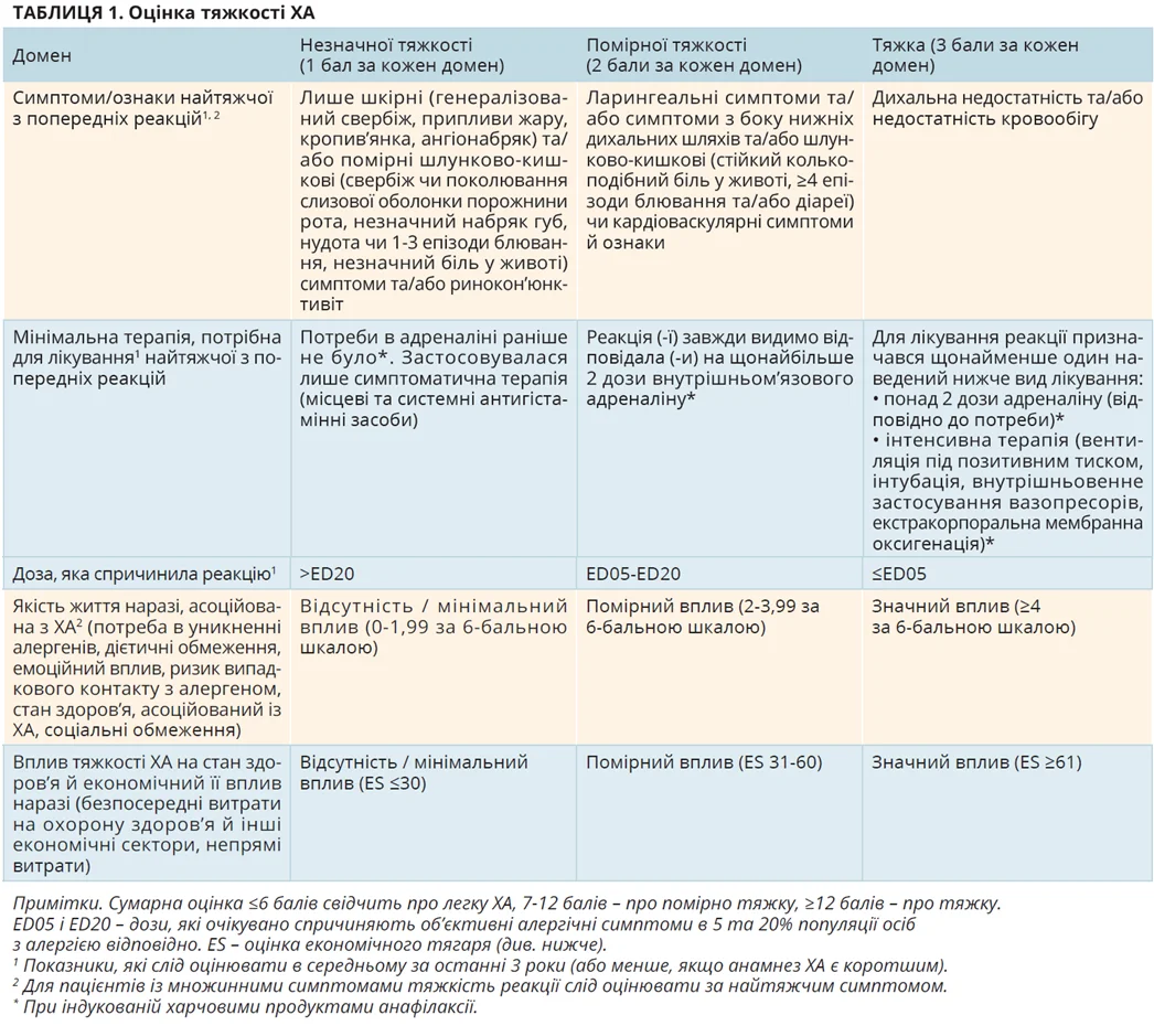 Повноцінне визначення ХА як багатогранної хвороби дотепер відсутнє, що перешкоджає наданню оптимальної медичної допомоги. У зв’язку із цим Всесвітня організація алергії започаткувала проєкт створення міжнародної системи визначення та класифікації тяжкості ХА (DEfinition of Food Allergy SEverity, DEFASE). Із цією метою робоча група з 54 експертів сформувала основні положення консенсусу й узгодила їх шляхом голосування. Зокрема, для оцінки тяжкості ХА запропоновано враховувати бальну оцінку за різними доменами (табл. 1).