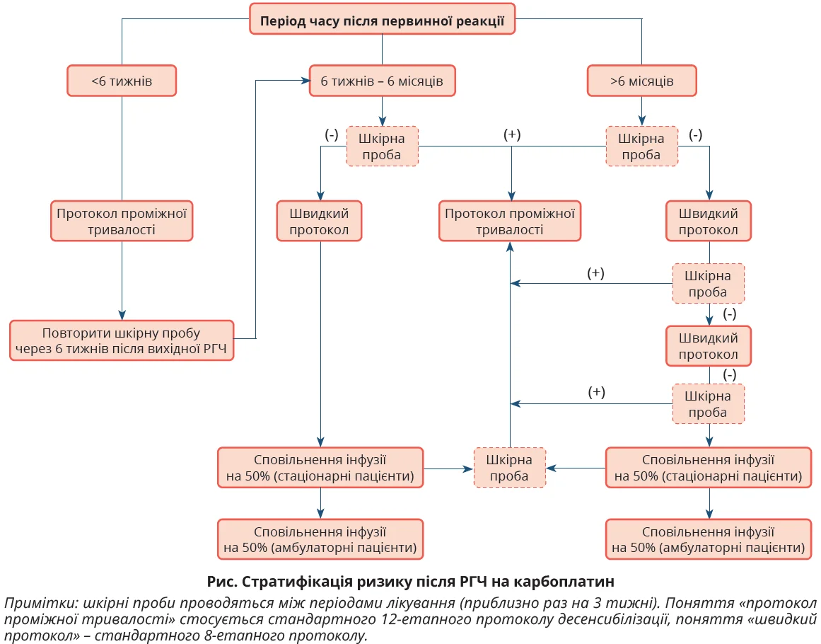 Для пацієнтів із РГЧ на карбоплатин запропоновано протокол стратифікації ризику на основі трьох серійних шкірних проб (рис.); вивчаються також одноетапні протоколи.