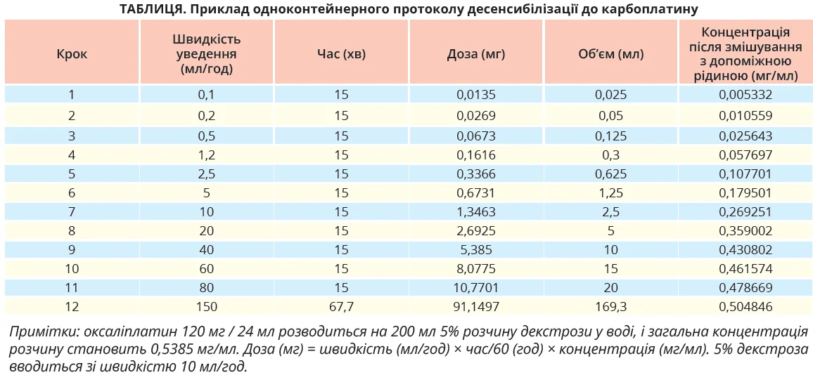 Для пацієнтів із позитивним результатом шкірної проби запропоновано різні протоколи десенсибілізації, найвивченіший з яких передбачає 12 кроків і є досить успішним. Складність цих протоколів зумовила винайдення й випробування одноетапного протоколу (табл.).