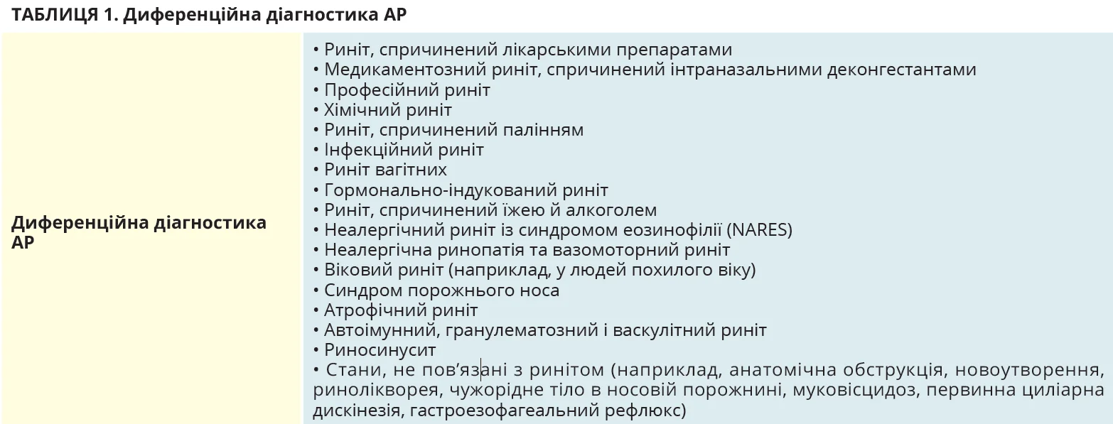 АР – це IgE-опосередкована реакція гіперчутливості 1 типу, що виникає внаслідок впливу алергену на слизову оболонку носа сенсибілізованої людини. Класичні симптоми АР, як-от ринорея, закладеність/обструкція носа, свербіж у носі та чхання, є неспецифічними й можуть супроводжувати багато інших станів, не пов’язаних з алергією (стислі рекомендації щодо диференційної діагностики АР подано в таблицях 1-4).