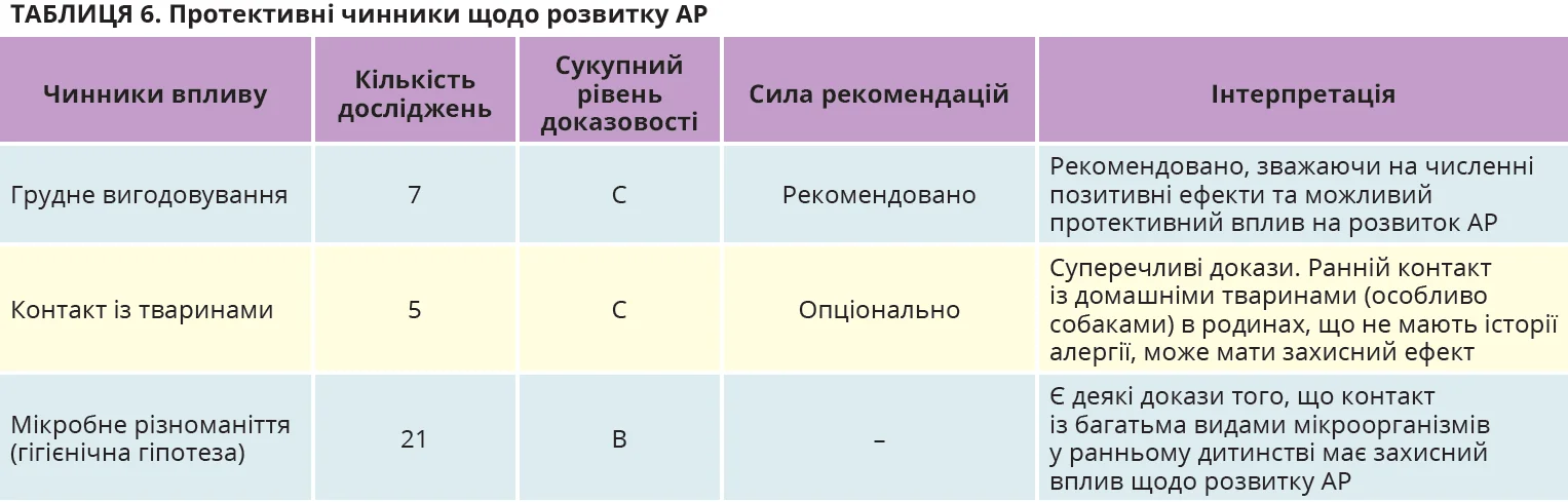 Обмеження вживання вагітними та жінками, що годують груддю, високоалергенних продуктів, як-от коров’яче молоко, яйця, арахіс і риба, не асоційоване зі зниженням схильності до АР у їхніх дітей; але було виявлено асоціацію між підвищеним умістом жирної риби й горіхів у материнській дієті та зниженням алергічних ризиків у дітей. Грудне вигодовування тривалістю щонайменше 4-6 місяців є рекомендованим для всіх немовлят, зважаючи на численні позитивні ефекти для матері та дитини, а також наявні дані щодо можливого протективного впливу на розвиток АР у дітей. Раннє (до 2 років життя) виникнення сенсибілізації до харчових алергенів у дітей пов’язане з вищими ризиками розвитку АР протягом дитинства, особливо коли харчова чутливість комбінується із сенсибілізацією до інгаляційних алергенів. Проте не існує чіткої кореляції між обмеженням уживання дітьми високоалергенних продуктів і нижчими ризиками розвитку АР. Отже, жорсткі обмеження дієти для вагітних і жінок, які годують груддю, дітей не рекомендовані з метою профілактики АР, а введення прикормів для немовлят у віці 4-6 місяців має відбуватися для всіх дітей незалежно від їхньої сімейної історії алергічних захворювань та індивідуального атопічного ризику.