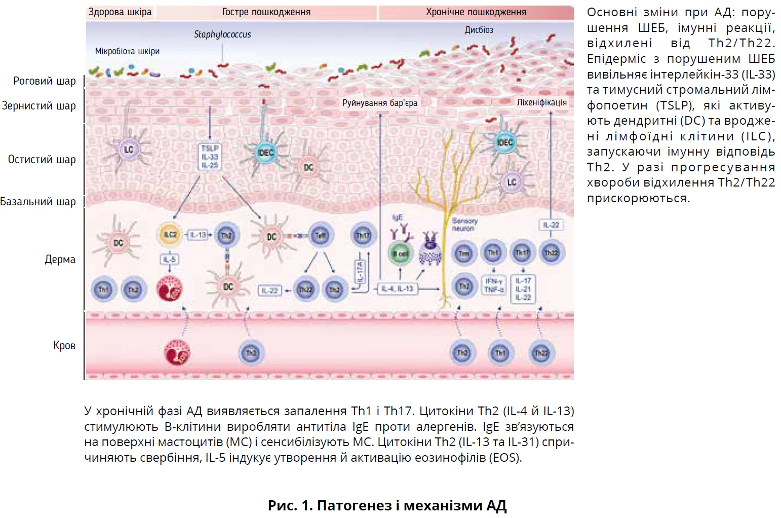 У шкірі пацієнтів з АД домінує імунна відповідь Th2 з можливим внеском інших імунних шляхів – Th1, Th17 і Th22 (рис. 1). Активовані клітини Th2 вивільняють цитокіни – інтерлейкін-4 (IL-4) й IL-13, які спричиняють дисфункцію ШЕБ, пригнічуючи експресію бар’єрних білків, зокрема філагрину. З’являються докази щодо більш значущої патогенетичної ролі IL-13 порівняно з IL-4. Обидва цитокіни використовують α-рецептор IL-4 2-го типу. У разі АД експресія гена IL-13 у шкірі підвищена; експресія IL-13 негативно корелює з функцією генів ШЕБ, натомість блокування IL-13 ралокінумабом скасовує індуковане IL-13 зниження експресії генів у дослідженні in vitro.