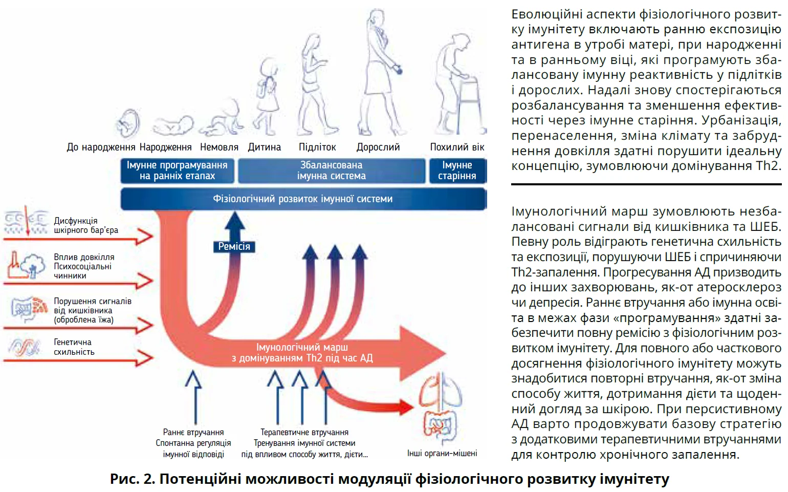 На фізіологічний розвиток імунної системи активно впливають дієта та кишково-мікробні сигнали, які формують «нормальний» стан імунної відповіді. З іншого боку, порушення ШЕБ і активація вродженої імунної системи в шкірі можуть призвести до хронічного запалення, змінюючи фізіологічний шлях імунологічного маршу. Ці знання надають унікальні можливості для різних стратегій втручання: 1) шляхом надання природних імунних сигналів на ранньому етапі життя (можливо, під час вагітності), які прискорюють фізіологічний розвиток; 2) шляхом відновлення функції ШЕБ і зменшення епікутанної сенсибілізації; 3) шляхом фармакологічного втручання (наприклад, раннє й інтенсивне лікування запалення шкіри); або комбінацій указаних стратегій. Однак ефективність цих заходів може залежати від часу втручання, котрий іще належить визначити. Наприклад, у дорослих позитивні ефекти від зміни зовнішніх чинників зазвичай нетривкі; для збереження ефекту може знадобитися постійна модифікація поведінки. Адаптацію способу життя пацієнтів до атопічного захисту за допомогою дієт, підвищення активності та відмови від куріння слід розглядати як терапевтичний захід у лікуванні AД. Навчання цьому має бути частиною догляду за пацієнтом. Невідомо, чи існує певний часовий проміжок у ранньому віці, коли екологічні або терапевтичні втручання мали б довгострокову користь. Дієта матері під час вагітності може вплинути на ризик розвитку AД у дитини, що вказує на важливість пренатального впливу. Крім того, вплив вагінального мікробіому матері під час народження може знизити ризик виникнення АД. Отже, з’являється чимраз більше доказів щодо можливості позитивного впливу втручань на ранньому етапі життя для запобігання імунологічному маршу та його клінічній кореляції – атопічному маршу в довгостроковій перспективі.