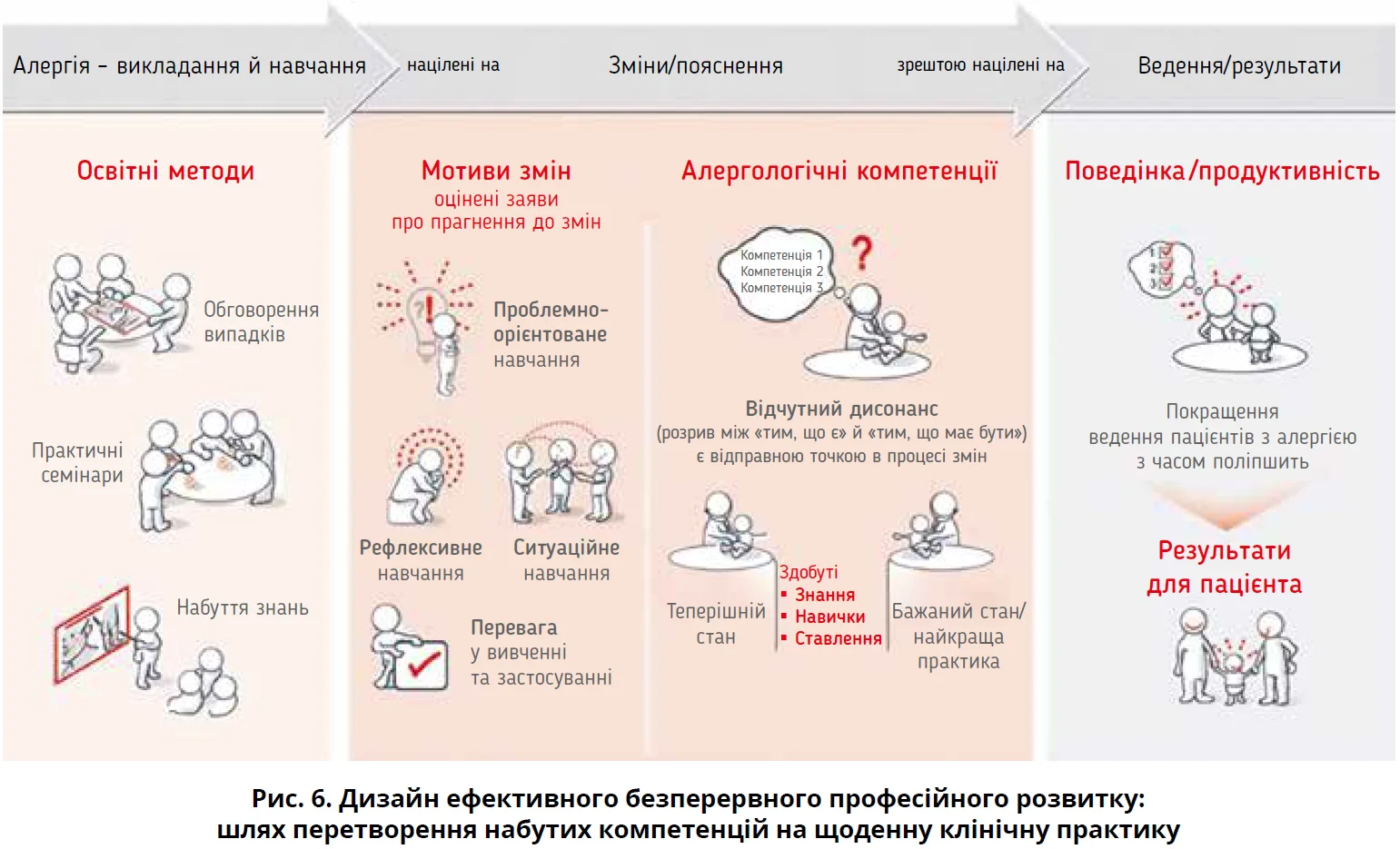 Пріоритетними є цілісні передові методи навчання, що ґрунтуються на доказах. Важливо оцінювати потреби шляхом «аналізу прогалин». Для ефективної передачі знань і навичок потрібно залучати інтерактивні методи, як-от «змішане навчання» та «перевернута класна кімната», а також інноваційні підходи, зокрема «дизайн мислення». Вибравши адекватні методи навчання, можна досягти мотивації до змін і кращої компетентності щодо алергії, а отже, змін поведінки та покращення результатів (рис. 6).