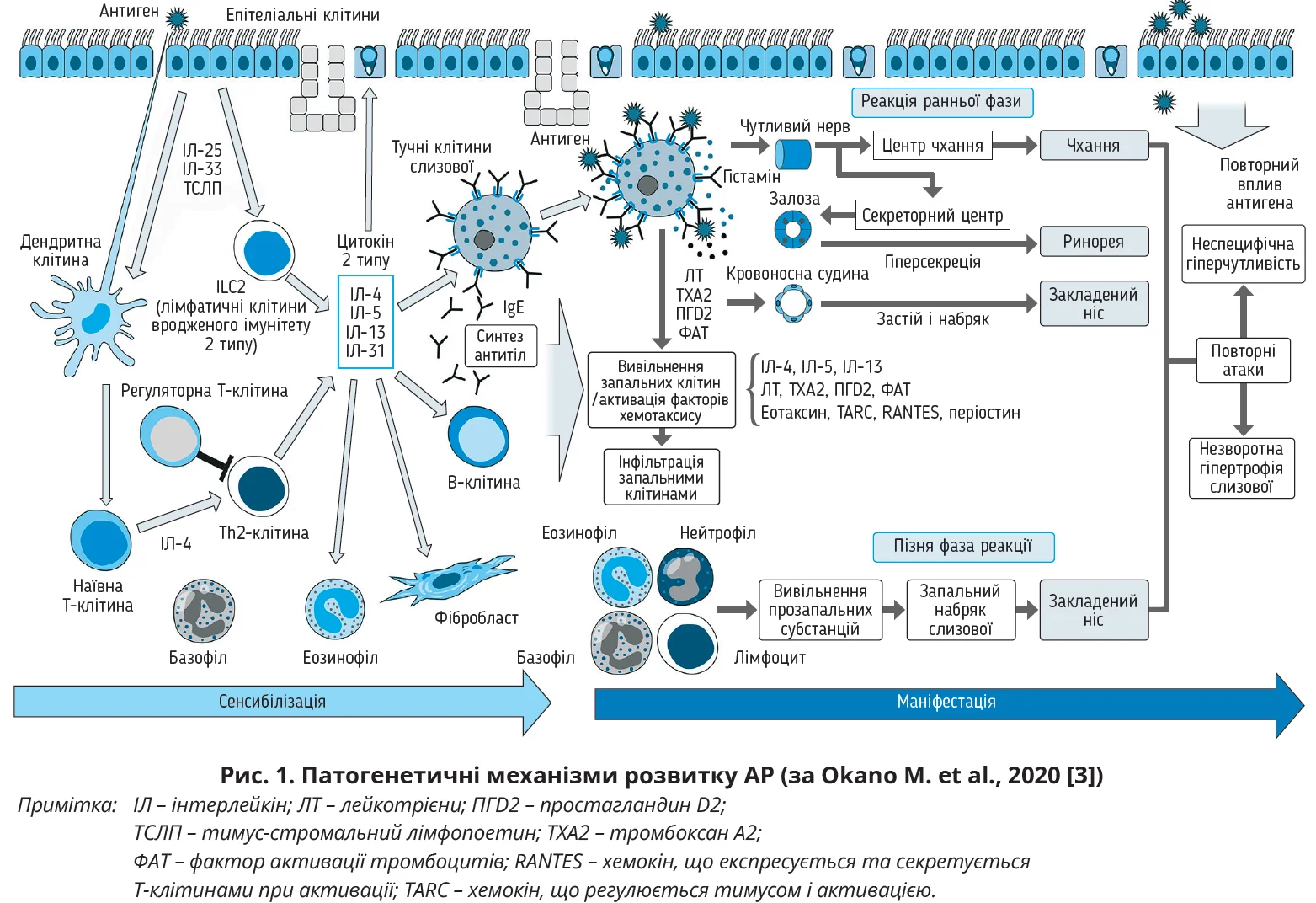 Розрізняють дві патофізіологічні фази розвитку АР: ранню та пізню. У сенсибілізованих осіб інгаляційні АГ проходять через епітеліальні клітини слизової оболонки носа та зв’язуються з IgE тучних клітин, які локалізуються в поверхневому шарі слизової оболонки. Взаємодія АГ – антитіло зумовлює вивільнення біологічно активних речовин із тучних клітин, у тому числі гістаміну та пептиду LT [3]. У ранній фазі захворювання ці субстанції подразнюють сенсорні нервові закінчення та кровоносні судини слизової оболонки носа, що призводить до виникнення чхання, водянистої ринореї, набряку слизової оболонки, закладеного носа. На пізній стадії, яка розвивається через 6-10 годин після контакту з АГ, різні запальні клітини, в тому числі активовані еозинофіли, інфільтрують слизову оболонку носа у відповідь на дію прозапальних цитокінів (рис. 1). Отже, рання фаза АР спричинена IgE-опосередкованою реакцією АГ – антитіло 1 типу; пізня фаза характеризується інфільтрацією запальними клітинами, а повторний вплив АГ спричиняє неспецифічну гіперчутливість і незворотний набряк слизової.