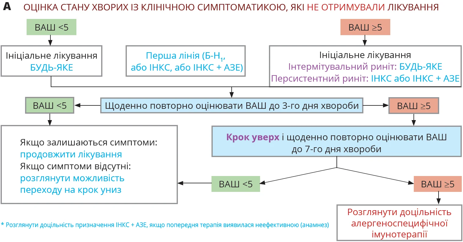 ARIA. Алгоритм заснований на використанні візуальної аналогової шкали (ВАШ) та віддає перевагу призначенню антигістамінних препаратів (АГП) із групи блокаторів Н1-рецепторів (Б-Н1) та інгаляційних кортикостероїдів – ІНКС (рис. 2).