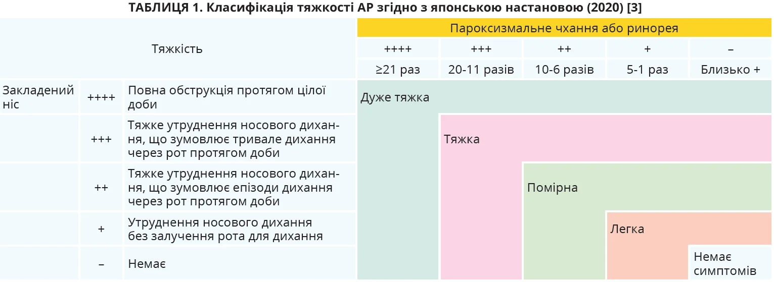 Відповідно до класичних уявлень, АР класифікують на сезонний і цілорічний [3]. Сезонний АР асоційований із дією АГ на відкритому повітрі, тоді як цілорічний АР зумовлений впливом АГ у приміщенні. Проте кліматичні зміни та полісенсибілізація вносять певні труднощі у використання цієї класифікації. Додатково розрізняють інтермітувальний АР, який визначають як виникнення симптомів рідше ніж 4 дні протягом тижня або менше ніж 4 тижні поспіль. Персистентний, або стійкий, АР характеризують як наявність симптомів понад 4 доби на тиждень протягом принаймні 1 місяця [5]. Японські спеціалісти наполягають на класифікації АР залежно від тяжкості захворювання та розрізняють легкий, помірний, тяжкий і дуже тяжкий перебіг (табл. 1) [3].