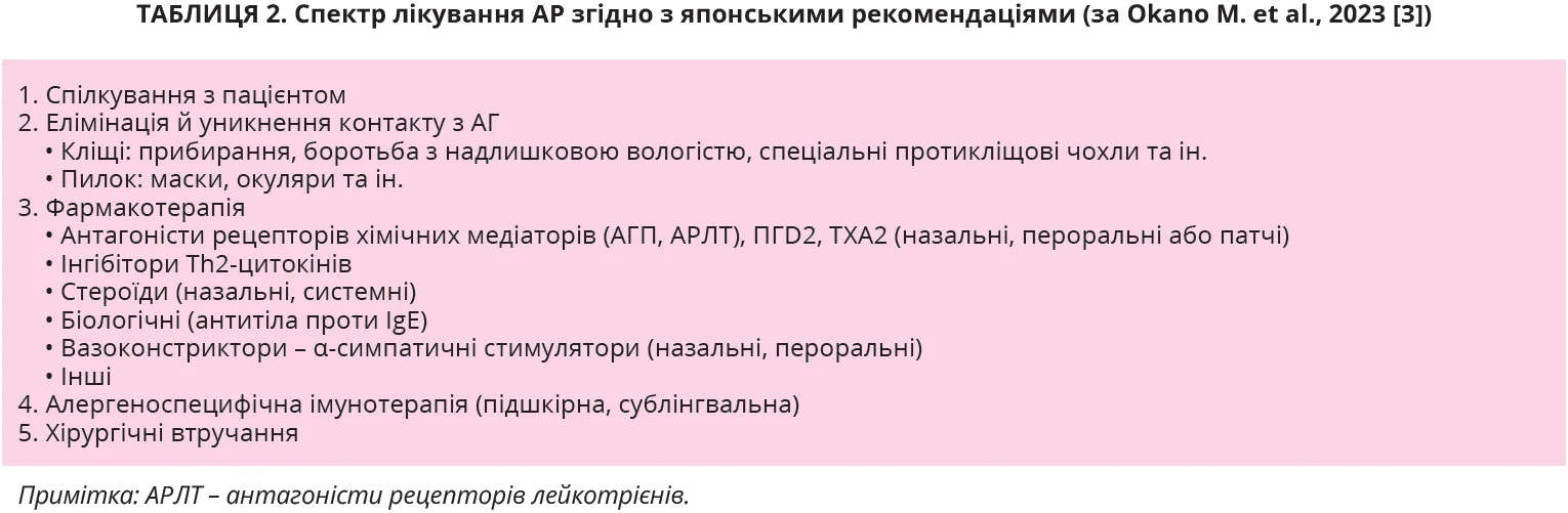 АР є поширеною патологією, його лікування регламентується різними міжнародними документами. Поточні стратегії лікування АР представлено в рекомендаціях ARIA, ICAR-Allergic Rhinitis 2023 та японській настанові. Два останні погоджувальні документи містять усебічний аналіз умов виникнення, особливостей перебігу АР і пропонують різні підходи до його лікування з огляду на ступінь тяжкості захворювання, передбачаючи застосування різноманітних сучасних ліків. Усі рекомендації підтримують призначення монотерапії Б-Н1 2-го покоління, ІНКС або застосування їх комбінації, японська настанова та ICAR-Allergic Rhinitis 2023 підтримують використання АРЛТ / антагоністів ПГD2/ТХА2 у комбінації з іншими засобами за тяжкого перебігу АР, неефективності попередньої терапії.