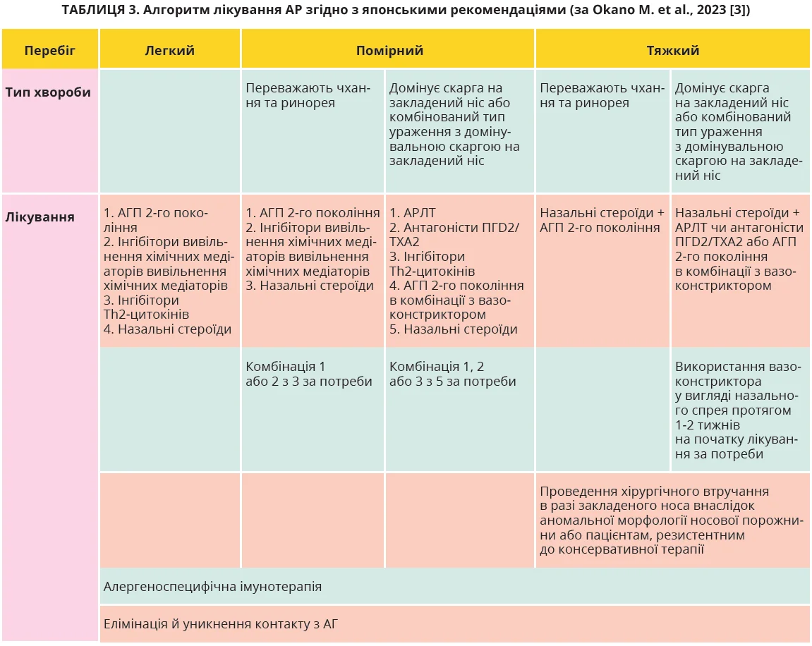 Фахівці Японського товариства алергології пропонують інший алгоритм фармакотерапії хворих на АР, який передбачає призначення одного засобу або комбінації декількох ліків залежно від тяжкості захворювання (табл. 3).