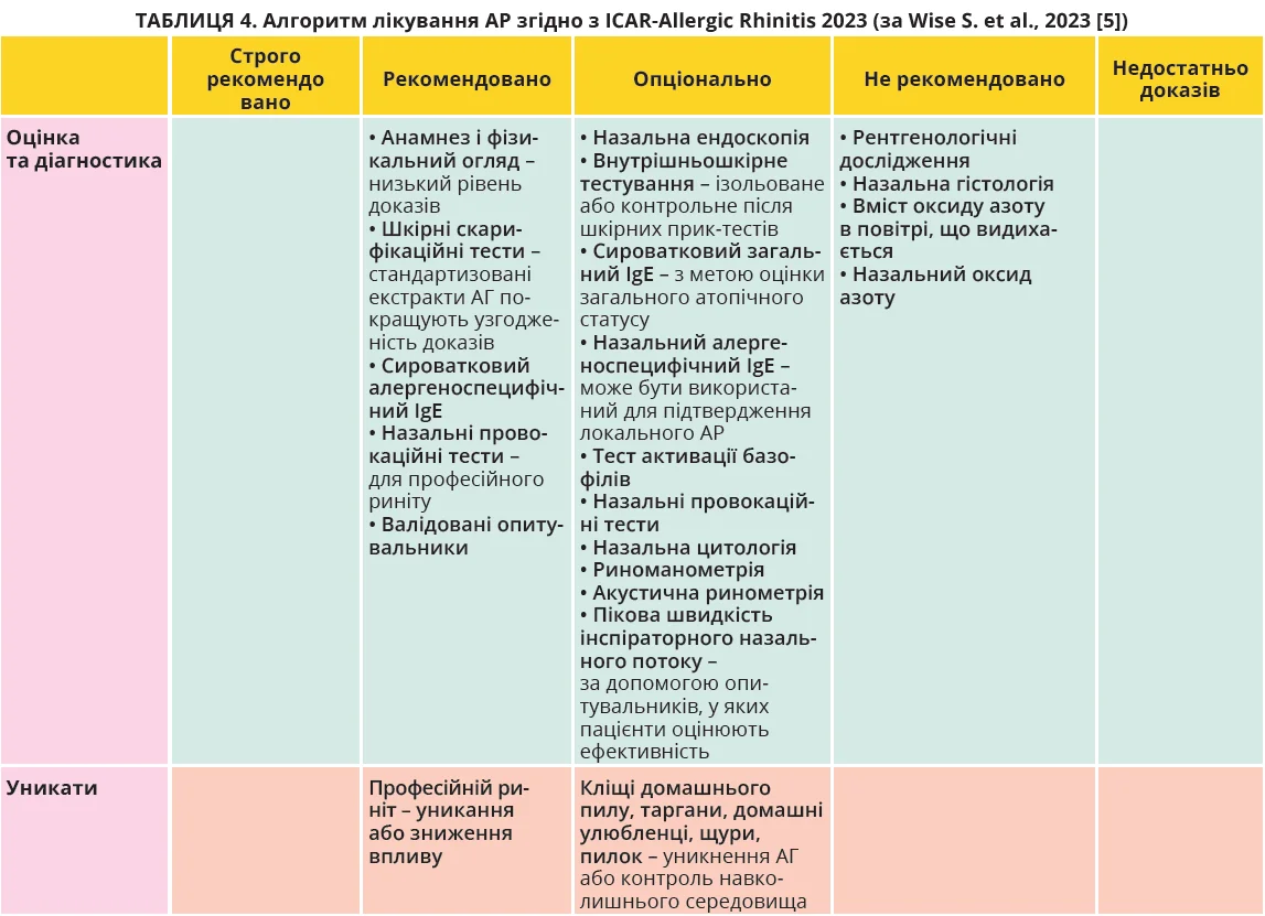 ІCAR-Allergic Rhinitis 2023. Оновлені рекомендації дещо подібні до положень японської настанови, передбачаючи застосування різноманітних фармацевтичних засобів. На відміну від ARIA та японських рекомендацій, алгоритм ІCAR-Allergic Rhinitis 2023 побудований з урахуванням ступеня доказовості рекомендованих втручань (табл. 4).