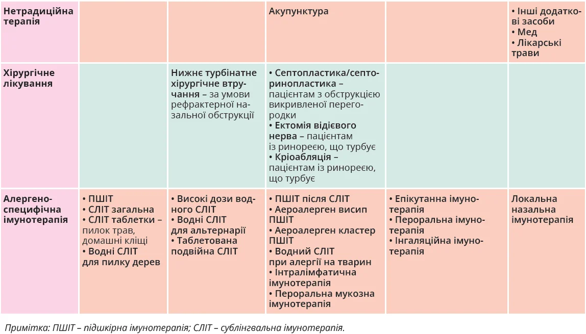Практичні настанови, що розглядаються, мають схоже ставлення до базисного нефармакологічного лікування АР. У кожній із них передбачаються уникнення контакту з АГ, прибирання приміщення, зниження вологості в кімнатах, що вважається запорукою ефективної боротьби з домашніми кліщами [1, 3, 5]. Рекомендуються носіння масок, окулярів для запобігання контакту з пилком, а також уникання контакту з тваринами, які здатні провокувати АР, проведення своєчасної гігієнічної обробки домашніх улюбленців [3]. Положення ІCAR-Allergic Rhinitis 2023 передбачають проведення санітарних заходів проти тарганів, гризунів та обмеження впливу професійних АГ [5].