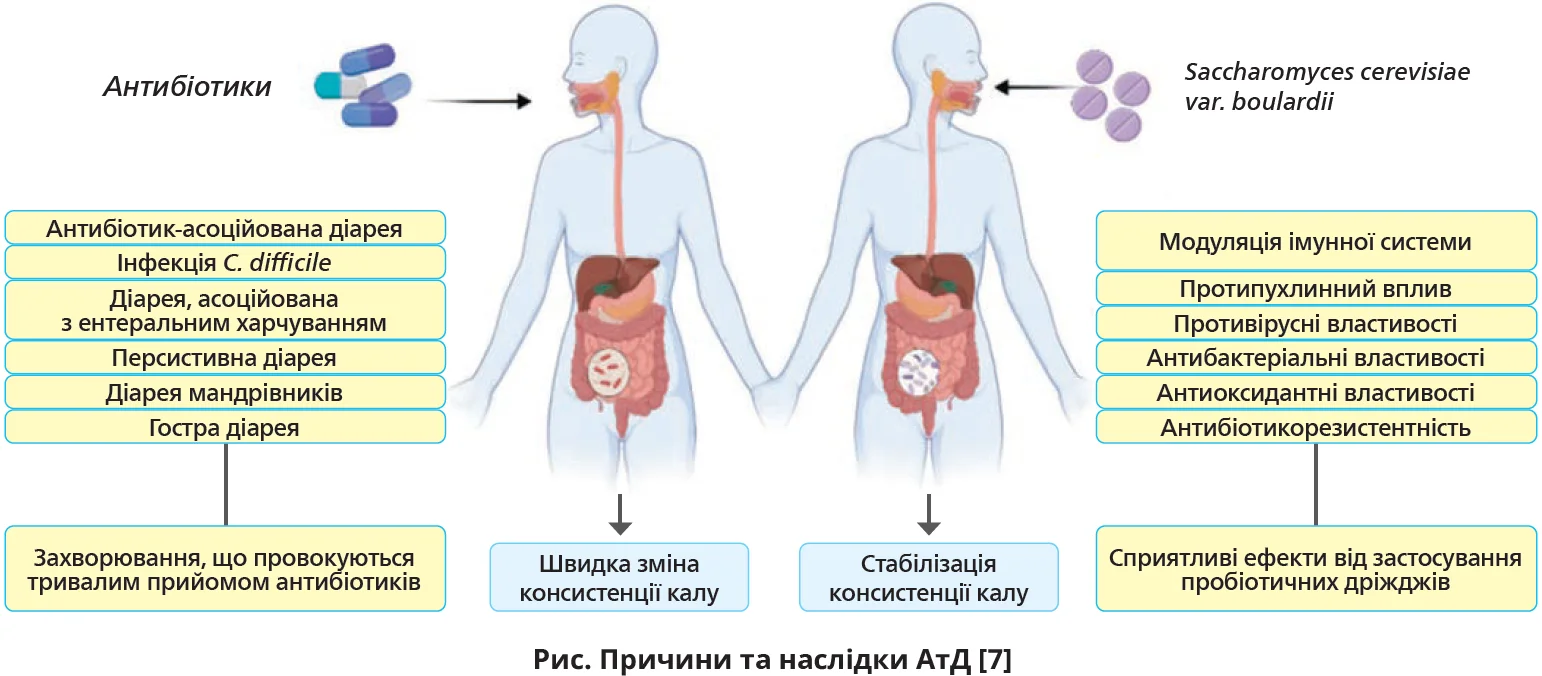Відповідно до одного з перших визначень ААД виникає за тривалого застосування АБ і призводить до кишкового дисбіозу [3]. Сучасні погляди дещо змінилися: нині підкреслюють, що кишківник являє собою домівку для великої кількості мікробів, включаючи бактерії, віруси, гриби, еукаріоти й археї, які разом утворюють складну гастроінтестинальну мікробіоту, котра відіграє важливу роль у підтримці здоров’я, та що саме порушення рівноваги в цьому складному мікробіомі на тлі прийому АБ спочатку призводить до виникнення дисбіозу, на тлі якого потім і розвивається діарея [28]. Зі збільшенням ступеня дисбіозу клінічні прояви ААД прогресують від легкої діареї до гострих і тяжких захворювань, як-от псевдомембранозний коліт за умов інфікування Clostridium difficile [3]. Нині відомо, що тяжкість клінічних проявів ААД пов’язана з типом призначеного АБ, спектром його дії та тривалості застосування, вихідним станом здоров’я пацієнта й мікробіологічними характеристиками патогенів [10]. Одним з ефективних способів профілактики та лікування ААД вважають усунення явищ дисбіозу за допомогою таких біологічно активних агентів, як пробіотики (живі мікроорганізми, котрі при введенні в достатній кількості можуть давати користь для здоров’я хазяїна) [8, 16, 21, 23]. Деякі вчені вважають, що з цією метою також можуть бути застосовані пребіотики (субстрати, які вибірково утилізуються мікроорганізмами хазяїна, даючи користь для здоров’я), синбіотики (суміші, що складаються з пробіотиків і пребіотиків) і постбіотики (препарати неживих мікроорганізмів та їхніх компонентів, які дають користь для здоров’я хазяїна). Проте впевнену доказову базу щодо доцільності та безпечності застосування при ААД мають усього два пробіотичні штами: Lacticaseibacillus rhamnosus і Saccharomyces cerevisiae var. boulardii (які раніше, до оновлення класифікації, називалися Lactоbacillus rhamnosus і Saccharomyces boulardii відповідно) [8, 16, 21, 23]. Причому велика кількість останніх міжнародних настанов наголошує на доцільності використання S. boulardii як у дітей, так і в дорослих [8, 16, 21, 23].
