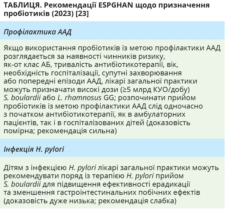 Консенсусний звіт Маастрихт VI / Флоренція з лікування інфекції H. pylori [16], як й італійські рекомендації з цього самого питання [21], передбачають застосування окремих пробіотиків для профілактики ААД при проведенні ерадикаційної терапії, причому експерти Маастрихт VI / Флоренція обмежують коло можливих пробіотичних штамів, зосереджуючи увагу лікарів-практиків саме на призначенні S. boulardii та Lactobacillus як найефективніших пробіотиків «у зменшенні побічних ефектів, пов’язаних із застосуванням АБ» [16].