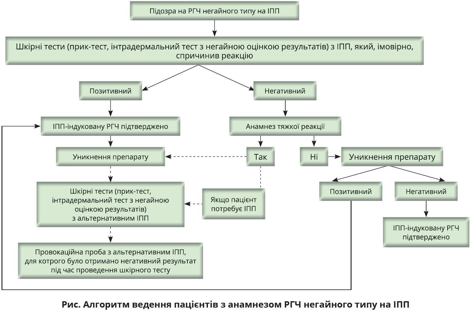 Значна частка пацієнтів з негайними РГЧ на ІПП відзначають більш як один епізод реакції на той самий препарат, імовірно, тому, що лікарі рідко підозрюють ІПП у ролі тригерів алергії. Отже, першим кроком у веденні таких пацієнтів є встановлення причинно-наслідкового зв’язку між прийомом ІПП та РГЧ. Спочатку проводиться шкірний тест, далі – провокаційна проба. Вибір альтернативного ІПП має також ґрунтуватися на результатах проб in vivo й in vitro (за доступності). Алгоритм ведення пацієнтів з РГЧ на ІПП представлено на рисунку.
